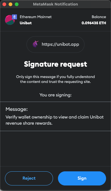 - Connect to your web wallet, ideally Metamask. After clicking Connect your wallet will prompt you to sign a message as shown above.